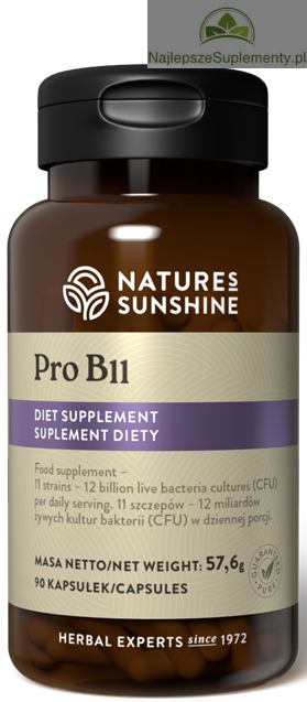 Pro B11 Natures Sunshine to naturalny suplement zawierający żywe bakterie o wielu szczepach o wysokiej mocy, który zawiera prawie 12 miliardów bakterii w jednej porcji. 11 szczepów bakterii zapewnia uzupełnienie jelit różnorodną pożyteczną florą. Każda kapsułka zawiera fruktooligosacharydy i inulinę, wbudowany prebiotyk odżywiający i rozprowadzający bakterie w jelitach.